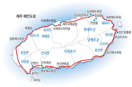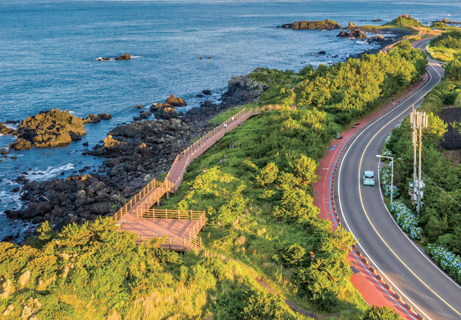 제주도는 그 자체로도 라이딩을 위한 천국입니다. 특히 제주 일주도로는 한라산을 중심으로 제주도를 한 바퀴 도는 코스로, 해안선과 어우러진 절경을 즐길 수 있습니다. 해변을 따라 달리는 동안 파란 하늘과 에메랄드빛 바다가 펼쳐져 있으며, 간간이 보이는 작은 해변 마을과 오름들은 이 코스의 매력을 더욱 높여줍니다. 특히 유채꽃이 만발한 봄철에는 그 풍경이 더욱 환상적입니다.